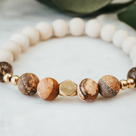 Pulsera de cuarzo ahumado, jaspe pictórico y piedras preciosas fósiles