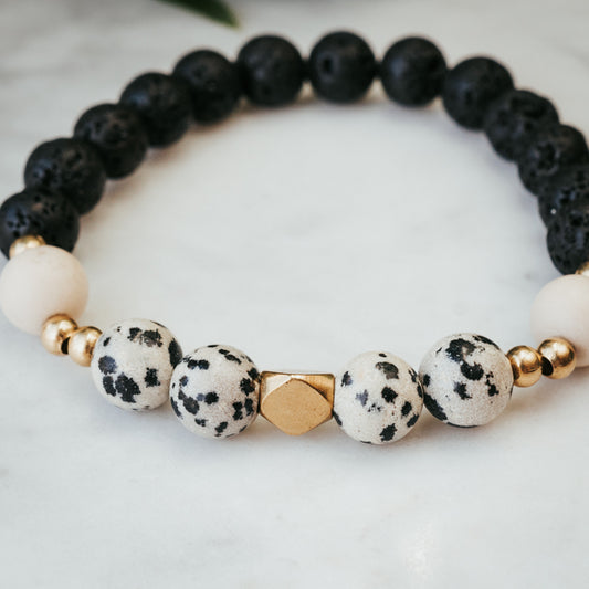 Pulsera de piedras preciosas gruesas | Dálmata, lava y fósil