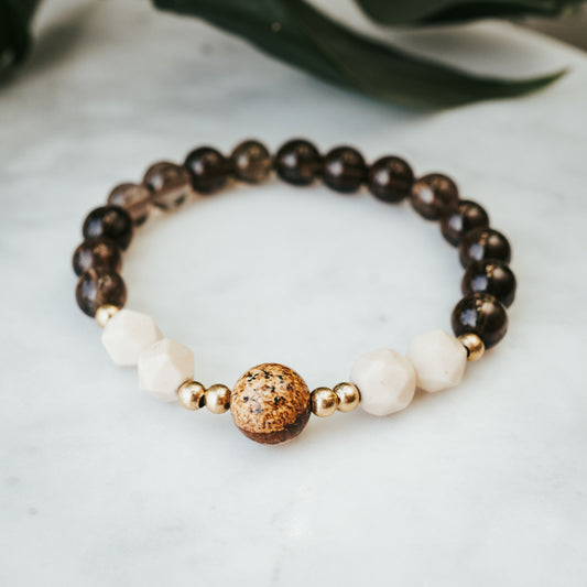 Pulsera de piedras preciosas gruesas | Jaspe pictórico, fósil y cuarzo ahumado