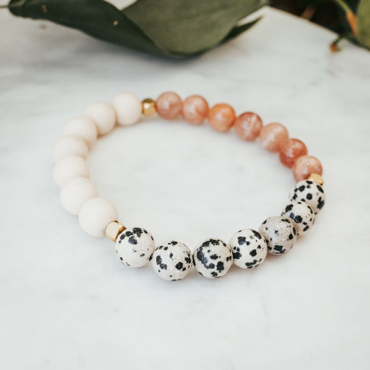Pulsera de piedras preciosas dálmatas, fósiles y piedra solar